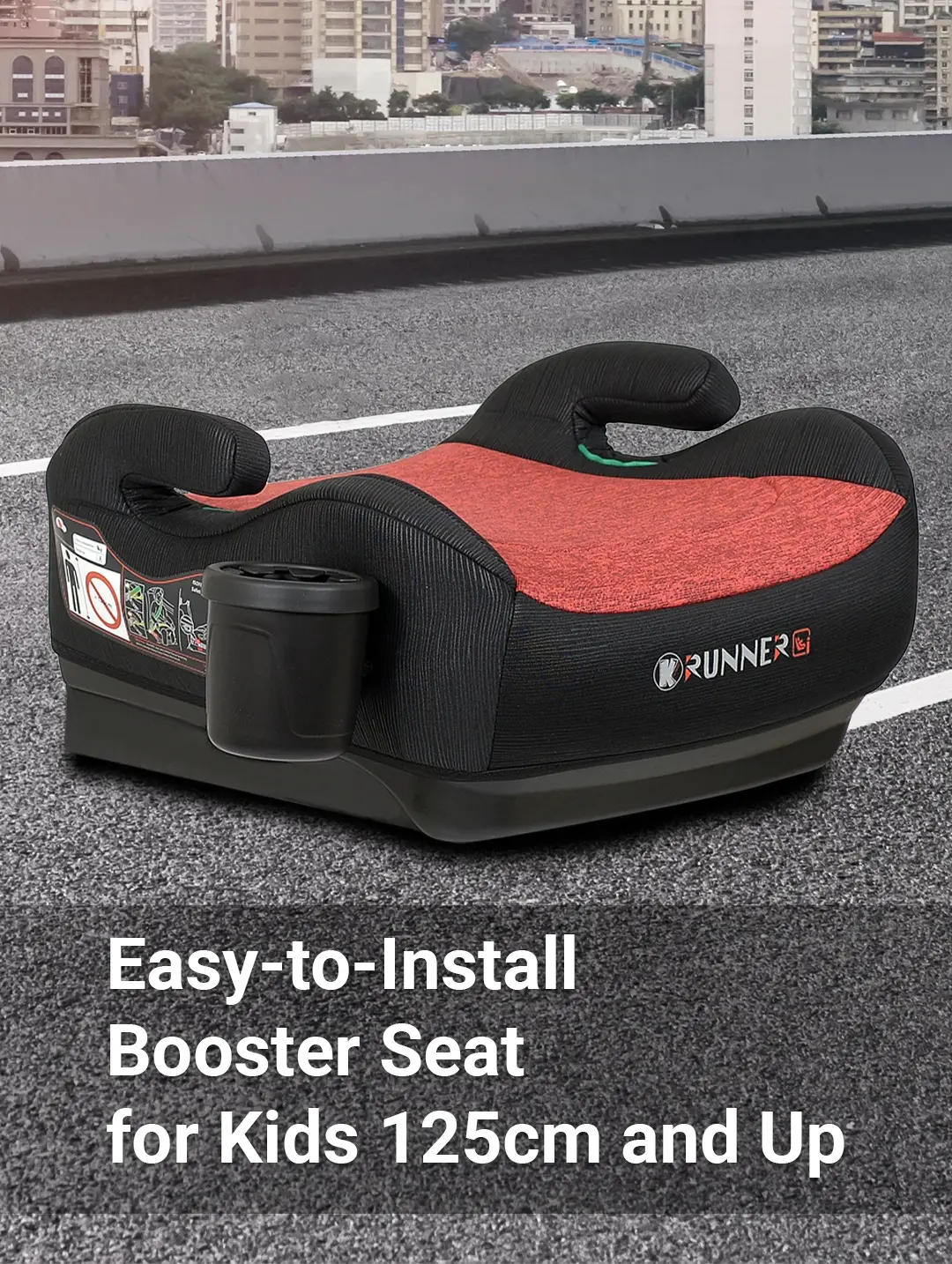 A booster seat designed for children 125cm and above (15-36kg) features a wide seatbelt guide, ergonomic design, and armrests for enhanced comfort.